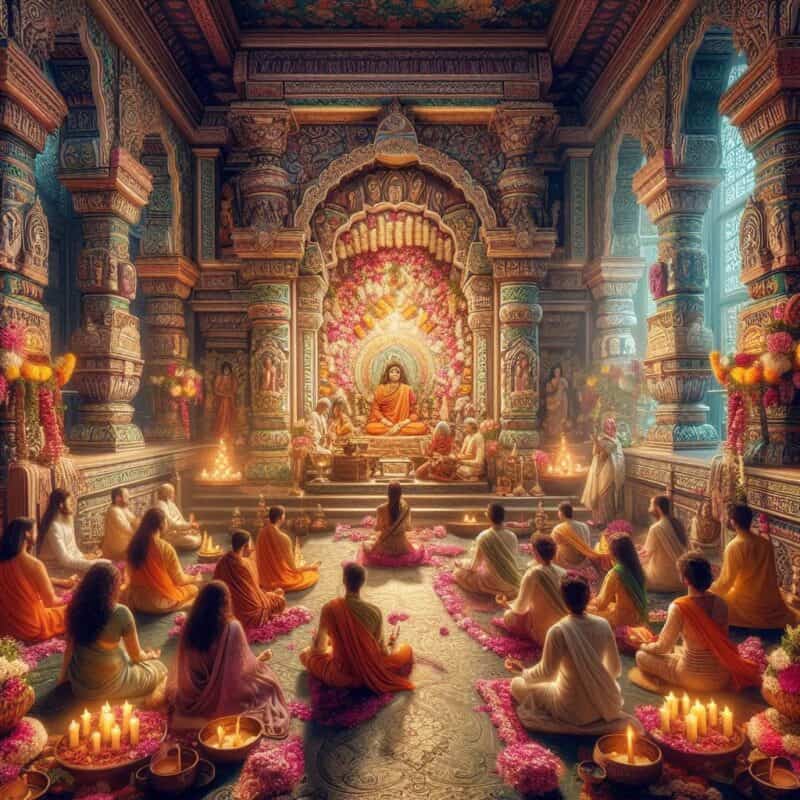Contains brass lamps, conch shells, ritual vessels, and a library of palm-leaf manuscripts.